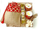 Hamper contains two pouches of raisins and almonds, a set of Ferrero Rocher chocolates, and a set of designer candles All in a designer-branded gift box INR 1600+ GST (based on quantity and food item selected prices will vary)