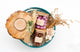 A wholesome wellness hamper featuring organic treasures like raw honey, authentic Kashmir saffron, and apple cider vinegar, all beautifully presented in a festive basket, along with a wood-carved tea light holder and a Diwali message greeting card.